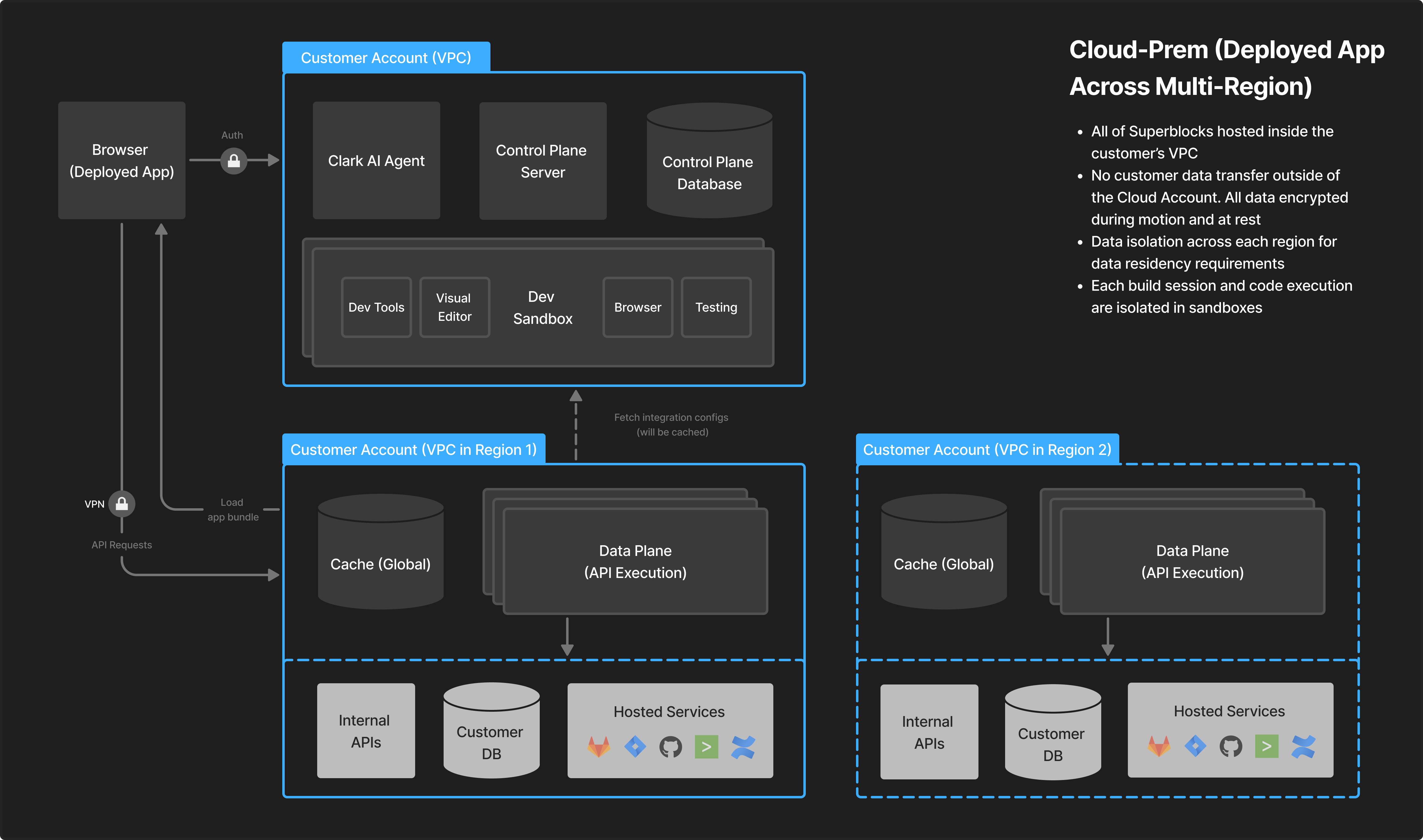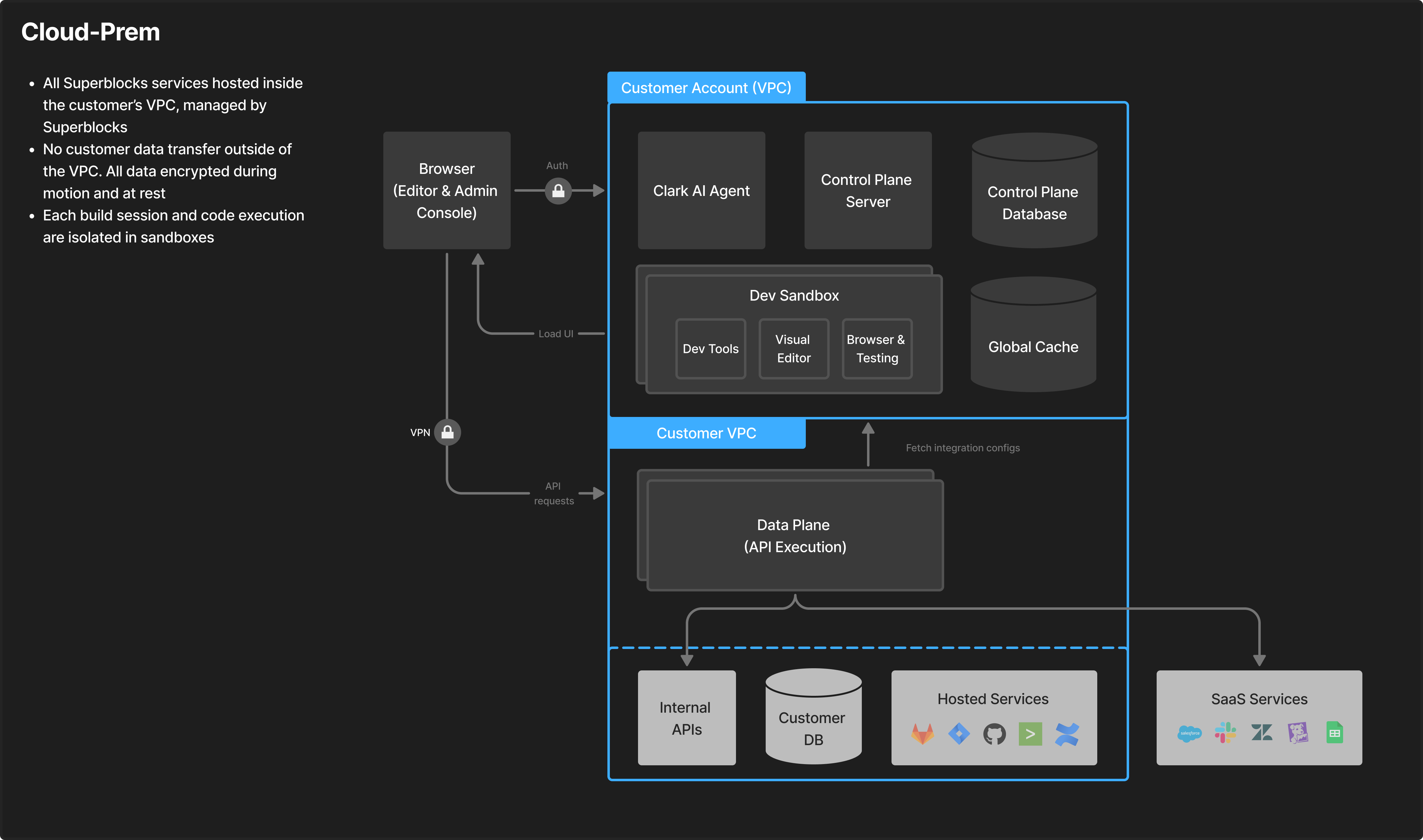 - Cloud-Prem – The full Superblocks platform, including AI inference, is deployed within your AWS, GCP, or Azure environment and fully managed by Superblocks