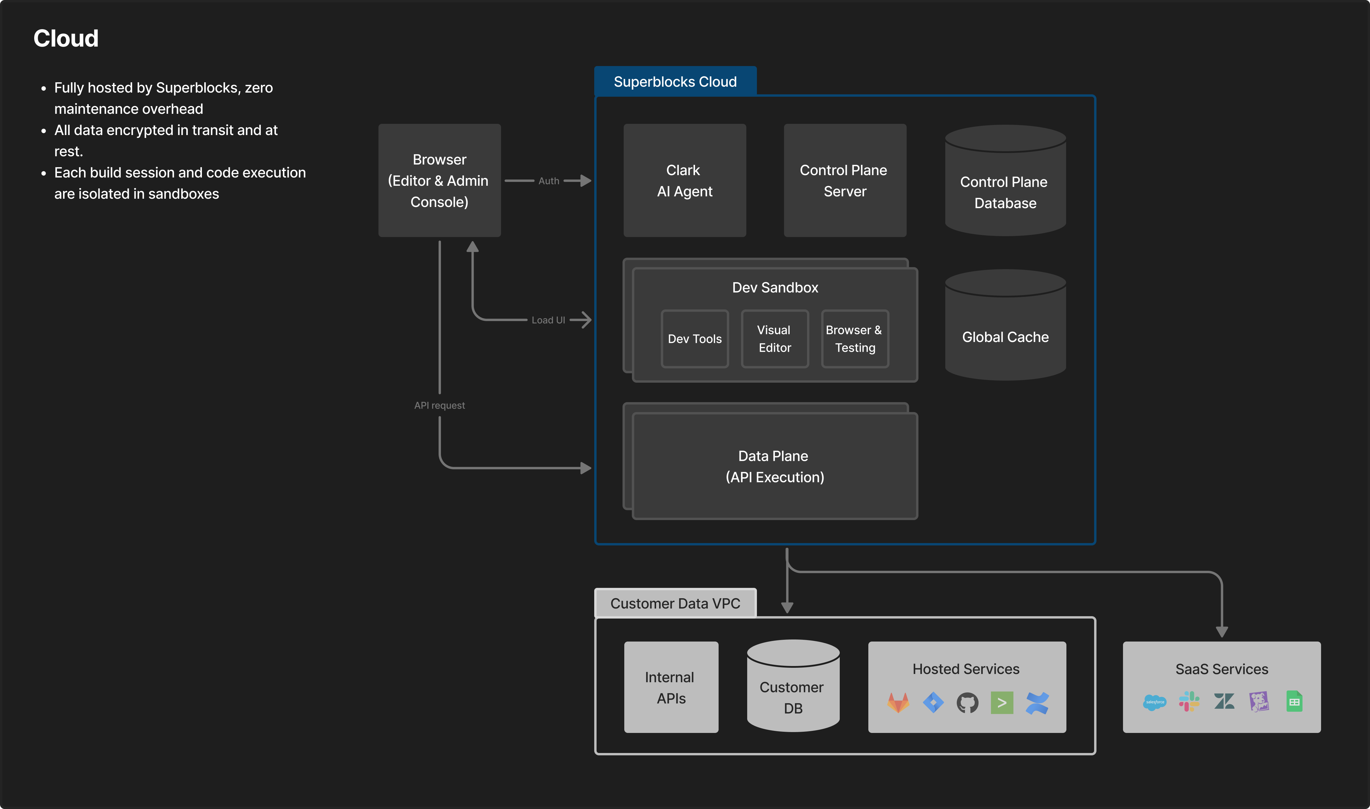 - Cloud – All data and AI inference run in the Superblocks Cloud
