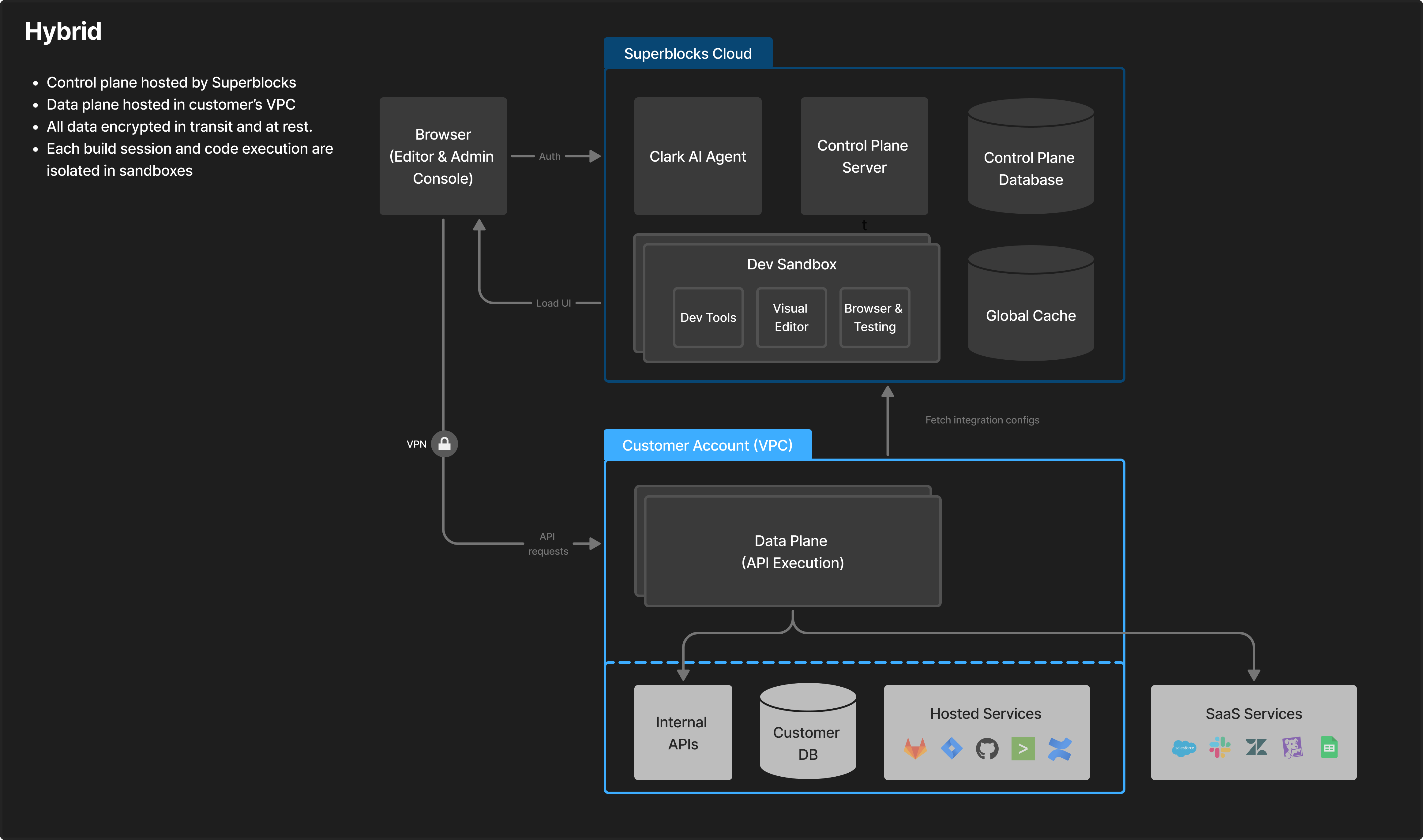 | Hybrid | Production data stays in-customer VPC with cloud-managed AI | Superblocks Cloud (non-prod data only) | Superblocks Cloud | Superblocks Cloud | Customer AWS, GCP or Azure Account | Data plane reaches private data sources without opening firewall |