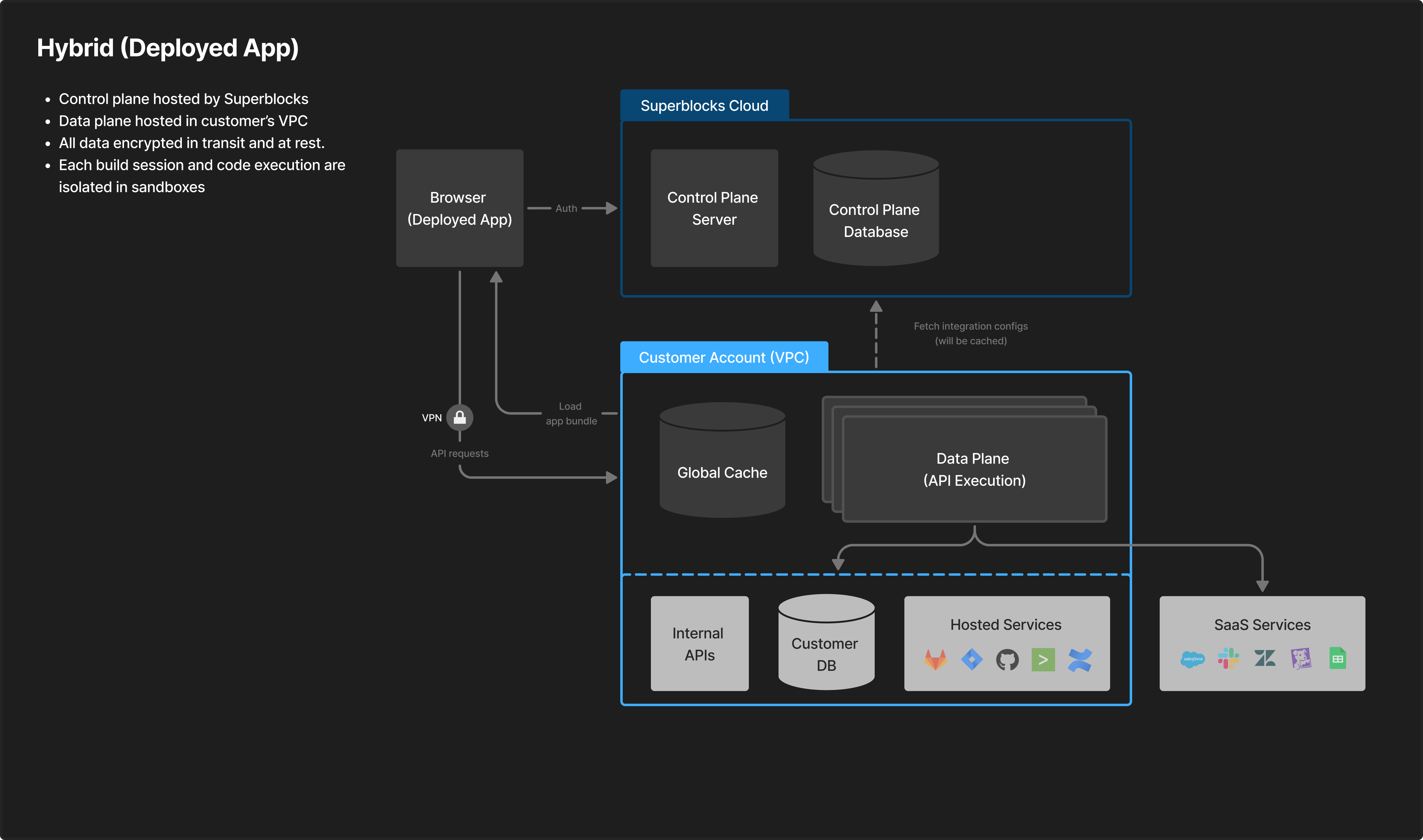 Superblocks Hybrid is designed for organizations that require production data and application execution to remain entirely within their AWS, GCP, or Azure environment, while offloading platform management and control plane operations to the Superblocks cloud. With Superblocks Hybrid, the Superblocks control plane and AI inference for development are hosted and managed in the Superblocks cloud, while the data plane is deployed inside your cloud provider VPC, directly colocated with your private production data. All production code executes locally within the customer network, ensuring production data never leaves customer-controlled boundaries. This model gives customers strong guarantees around production data residency, network isolation, and execution locality, while Superblocks manages the platform lifecycle—including upgrades, reliability, and operational support. The result is enterprise-grade security and control without the operational burden, slow iteration cycles, or complexity of a fully self-hosted deployment.