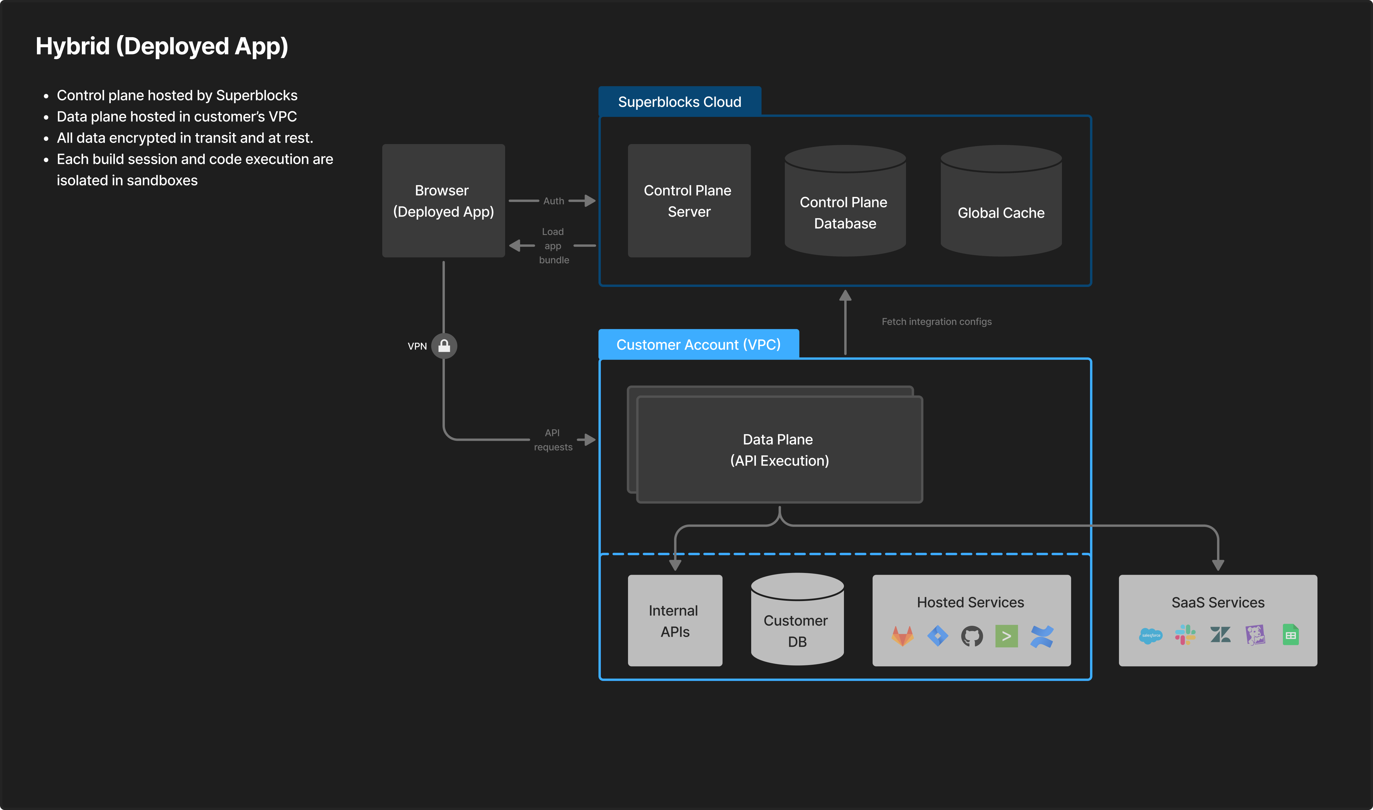 Superblocks Hybrid is best for enterprises that require private network execution and data locality, but want to avoid the operational overhead and cost a cloud-prem:- Private, high-performance production execution: All production application APIs, workflows, and data access execute locally inside your AWS, GCP, or Azure VPC—behind existing network controls—delivering low-latency, predictable performance with production data never leaving customer-managed boundaries.